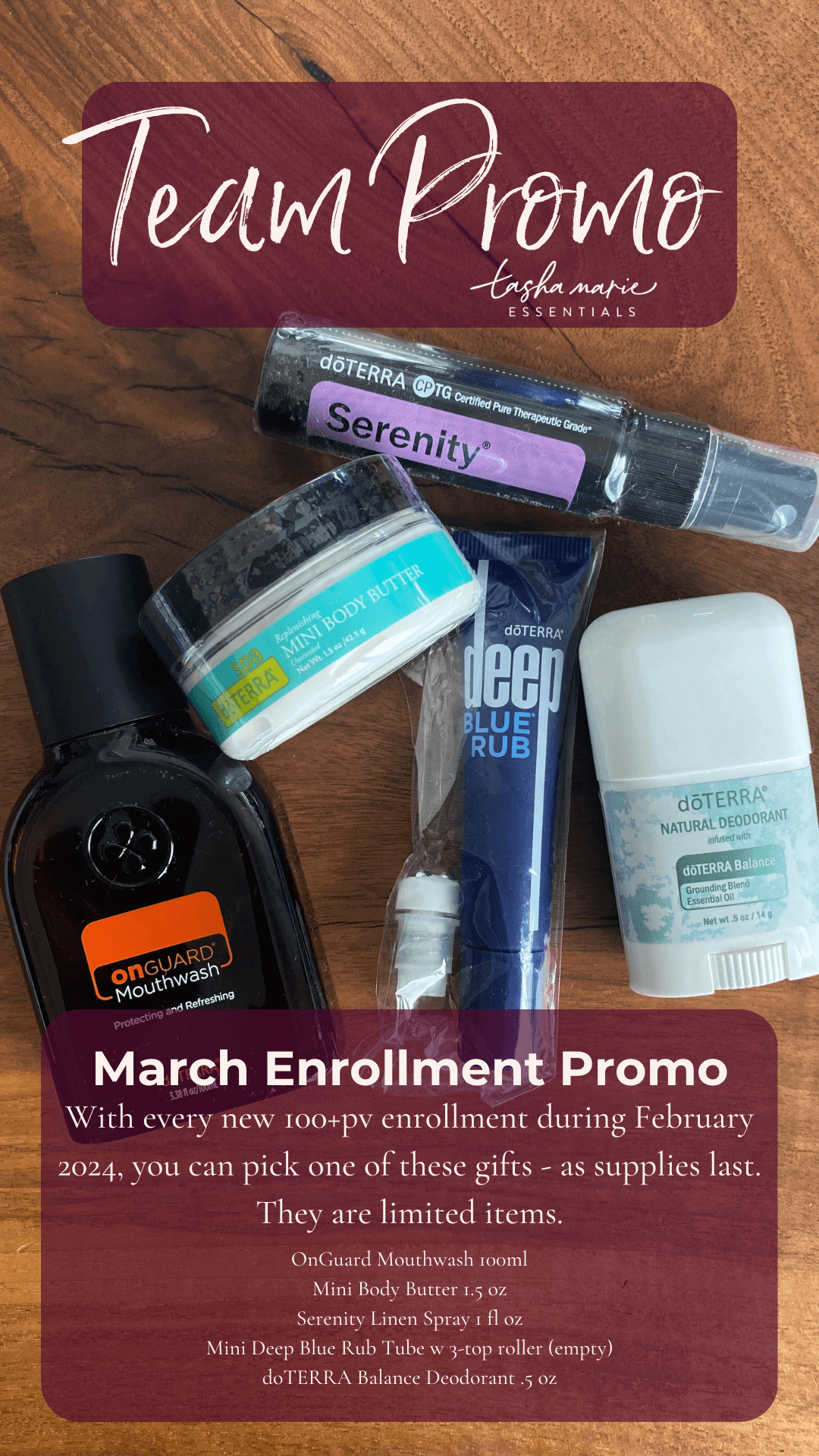 AND for our team promo, when you enroll with one of our Wellness Advocates, you will get your choice of one of these great products to try out! They are limited and first come, first serve. Once they are gone, they are gone! Check-in with your friend who has introduced you to the power of doTERRA for details ----