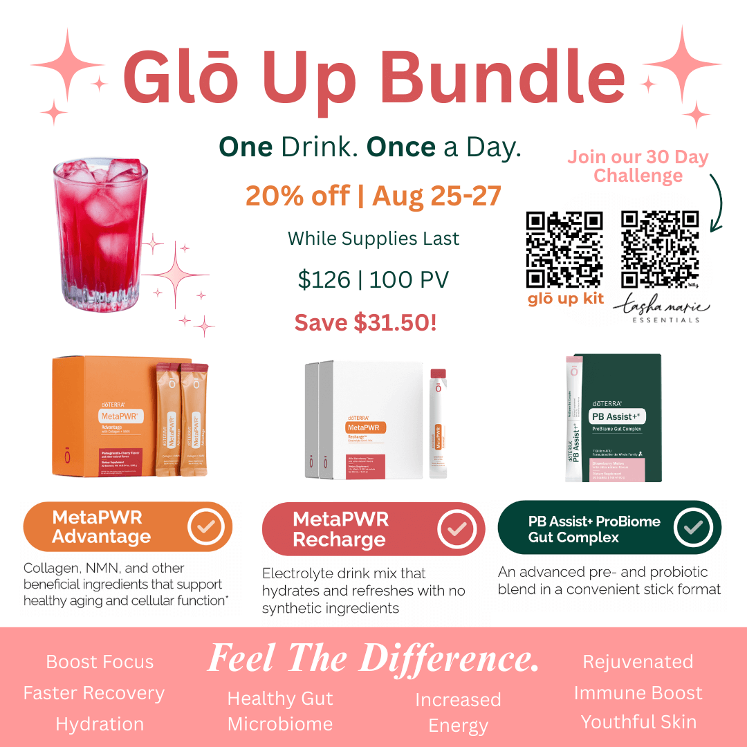 For three days only, enjoy the perfect synergy of hydration, collagen, and digestive support with our Glō Up Bundle. This exclusive set combines Wild Strawberry Recharge, Pomegranate Cherry Advantage (with 9 types of collagen), and PB Assist+ Sticks—all for just $126 (100 PV), a savings of 20% off retail.