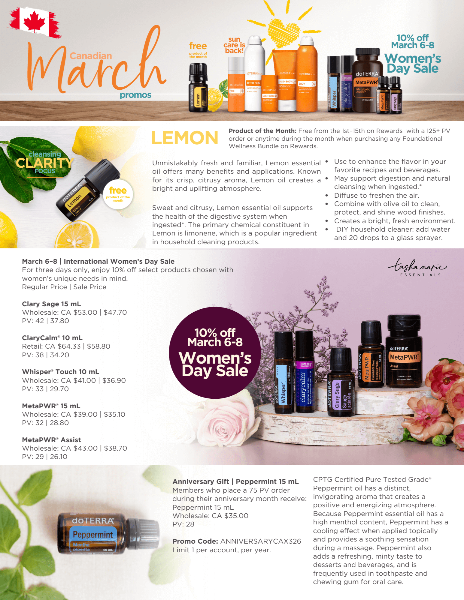 The March Product of the Month is Lemon 5 mL, available free with a 125 PV Rewards order placed by March 15 or anytime this month with a Foundational Wellness Bundle on Rewards.